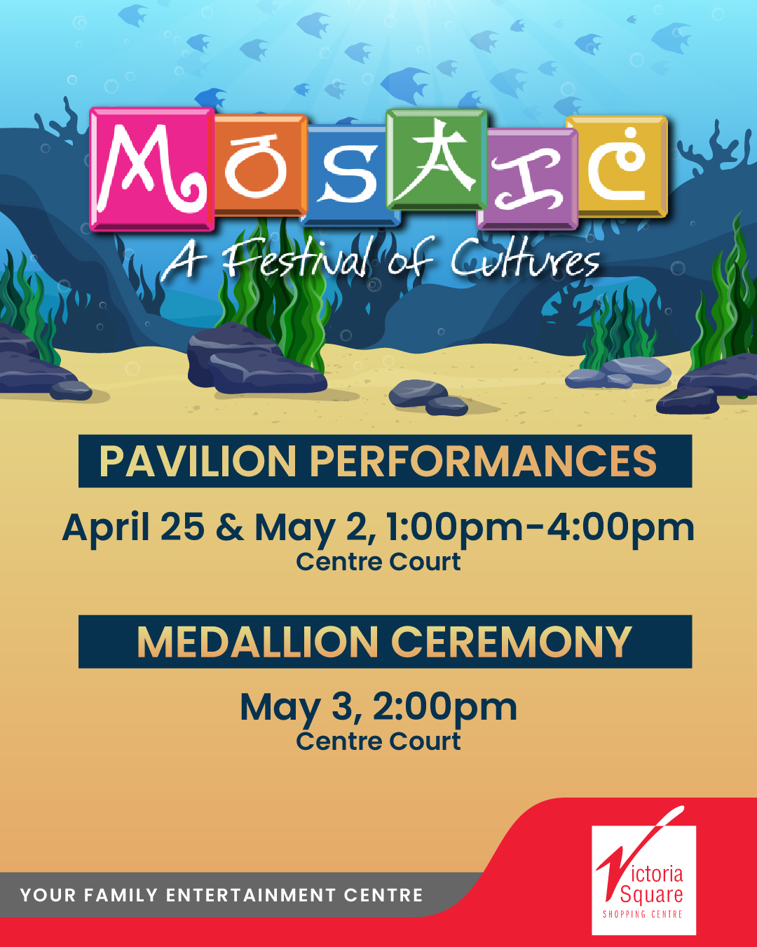 Victoria Square Shopping CentreWe're super excited once again to partner with the Regina Multicultural Council to bring Mosaic to VicSquare! π Join us May 3 for the Mosaic Ambassador Medallion Ceremony at 2pm! π